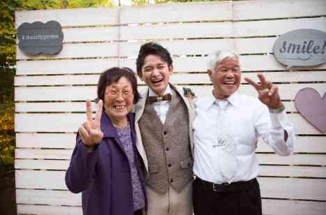 新郎様を幼い頃から可愛がってくれた大好きなおじいちゃん、おばあちゃん。 そのお二人に晴れ姿をみせて、ありがとうを伝えたい。 だけど前に出てきてお話は苦手かもしれないと新郎様がお席へお迎えに。 そしてエスコートしてくれた日のことを忘れない様に、フォトフレームのプレゼント。 ガーデンにて記念撮影をした写真をフレームに入れていただく、たったひとつのプレゼント。