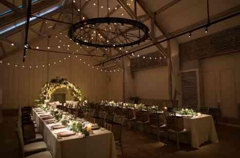 メインテーブルをゲストが集まりやすく、写真が撮りたくなる場所にしたい。 お二人のお好みの雰囲気に合わせてのオリジナルのメインテーブルには、ボリュームのあるアーチ型の装飾を。電飾を入れてナイトの雰囲気にも映えるように誰もがその場所で写真を撮り、自慢したくなるフォトブースへ変身。ゲストテーブルには会場に合わせてキャンドルが散りばめられ、おしゃれだけど落ち着く空間に。