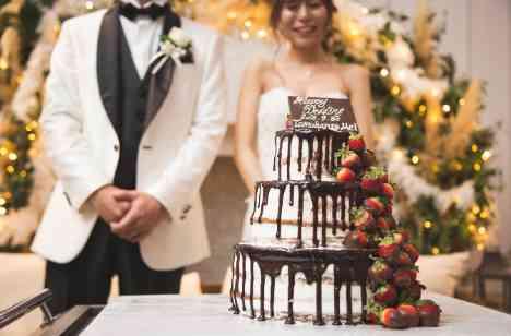 ゲストのみなさんに自分たちの大好きなものが詰まったウエディングケーキを食べていただきたい!そんな思いで考えたオリジナルケーキ。 イメージに合わせた曲がかかり、こだわりいっぱいのケーキが運ばれた。会場内が一体感に包まれ、幸せそうなお二人の周りは大切なゲストが自然に集まった。