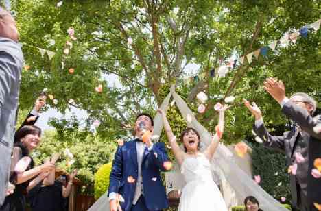 新郎入場の際はお父様からのジャケットセレモニー、リングガールは友人のお子様、お二人ならでの人前式は参列する皆の心をあたたかくする時間に。そして人前式後のフラワーシャワーでは、ここに集まる全員に幸せが降り注ぎますように・・・と想いを込め、お二人に向けてではなく、全員で花びらを真上に投げて頂きました。全員の笑顔が印象的なワンシーンに。