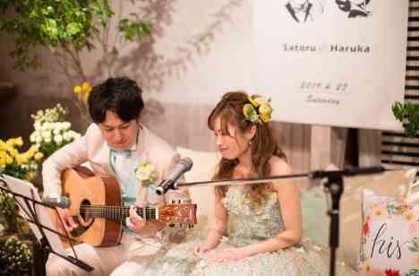 フィナーレの順番にもこだわった。挙式で行われることが多いウェディングツリーへの捺印。これをはじまりにした。ゲストの緊張もほぐれた時間だからこそ挙式よりもゲストとの気持ちの距離感が縮んだ。口下手な新郎だけれど、親御様への感謝の気持ちやゲストのへの感謝の気持ちを歌にのせてならしっかり伝えられる。お二人からの初めてのプレゼント。コトバの深みを知った瞬間だった。