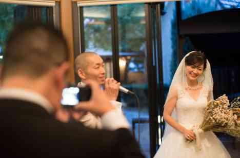 緊張させるのではなく、お二人の雰囲気で、いつもの言葉でゲストを緊張させない工夫。 会場内では新郎様がマイクを持って進行を務める。タイミングはお料理に合わせて、一体感ある雰囲気を感じながらの進行は、お二人だからこそつくれるアットホームな空間。
