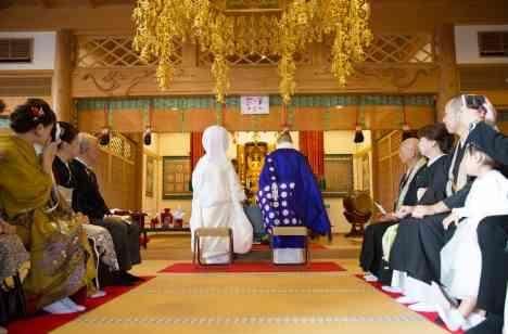 教会式や人前式など様々な挙式スタイルがある中で全体の約2%と言われている仏前式。 お世話になった方々と一緒につくり、見守っていただく式は終始和やかな雰囲気に。 式の結びに安心されたお二人の表情が印象的だ。