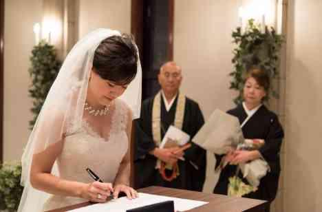 親御様に見守れての仏前式。夫婦の門出を見守っていただき ドレスに着替えてのファーストミート。 家族の時間として、ご家族へ宛てたお手紙朗読。 これからも見守っていてほしいという気持ちを込めて 親御様の前で婚姻届けに署名。