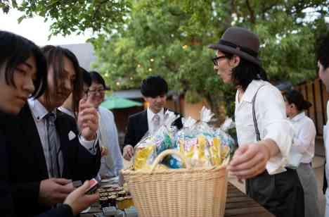 お買い物がお好きなお二人は、自分たちで選ぶギフトマルシェを選ばれた。 いつもお買い物しているわくわく感をゲスト皆様へも味わってほしい。 ガーデンにお二人が選んだギフトが並び まるでお二人のお店に来ていただくかのようにお二人からのおもてなしの時間となった。