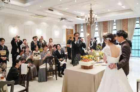 少人数ウェディングにはぴったりの披露宴会場の大きさ。 ゲストの表情が近くで見ることができ安心もできる。 ケーキ入刀の演出も席からも写真撮影が可能なぐらいアットホームな距離感でパーティーができる。 親族席も2列目で設定できるので、思わずお父様も写真撮影にきてしまうぐらい! 笑い越えや、感動のシーン一つ一つのシーンをゲスト全員で創り上げれるのが距離感の近さがいいところ!