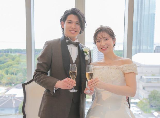 おふたりが選んだのは、やさしい光が降りそそぎ最上階から海を望む天空のバンケットルーム「フランドール」。カーテンがオープンした時に絶景が広がり、ゲストからも歓声の声が聞こえます。おふたりは大切なゲストと会話や写真撮影をする時間を多く作られ、おふたりはゲストのもとへ。距離が近い空間造りもされ、ゲストもおふたりも終始リラックスされてお過ごしになっていました。