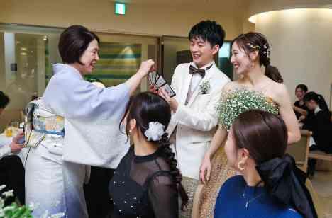 パーティ会場は、水辺のオーベルジュをテーマにしたバンケットルーム「アクアベル」。窓の外に広がるパノラマの景色は、時間の移り変わりとともにドラマティックに表情を変えるのが特徴的で、おふたりのパーティ後半は煌めく夜景へと雰囲気が変わり記念写真も素敵に映えていました。ご歓談を中心にしたおふたりのパーティは、会場内の水のせせらぎに癒されながら、ゲストやおふたりが楽しそうに過ごしている笑顔が印象的でした。