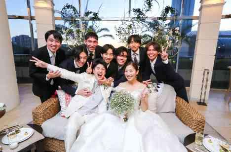 パーティ会場は、水辺のオーベルジュをテーマにしたバンケットルーム「アクアベル」。窓の外に広がるパノラマの景色は、時間の移り変わりとともにドラマティックに表情を変えるのが特徴的で、おふたりのパーティ後半は煌めく夜景へと雰囲気が変わり記念写真も素敵に映えていました。ご歓談を中心にしたおふたりのパーティは、会場内の水のせせらぎに癒されながら、ゲストやおふたりが楽しそうに過ごしている笑顔が印象的でした。