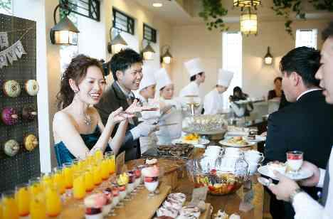 専属のパティシエがゲストの前でパフォーマンスをするライブデザートや 新郎新婦自ら、感謝の言葉を一人一人に伝えながらオリジナルのデザートでおもてなしをしていました。 ゲストの皆様との歓談のお時間や写真を撮ったりと 全員が笑顔になる時間でした。