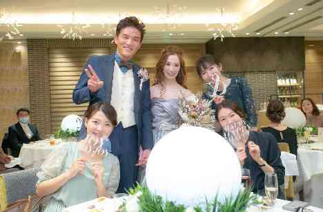 大切なゲストの皆さまに安心して楽しくお過ごしいただけるよう工夫をされたおふたり。 ゲストのお席には、飛沫防止にも活躍するお洒落なフォトプロップス「ハピネス・ハンディシールド」をご用意。 お料理も、好きなものを好きなだけ堪能してもらいたいという思いから、お寿司とデザートをブッフェスタイルでおもてなし。 おふたりのゲストへの思いが伝わり、ゲストの心からの笑顔が溢れる、パーティが叶いました。