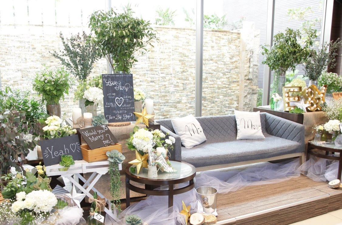 メインテーブルを取り払ったソファー席のメイン。ナチュラルテイストの装飾は、まるでフォトブースのようなメインにゲストも自然とメインに集まります。いつもとは雰囲気の違うウエディングパーティにゲストも驚きと感動を与えました。