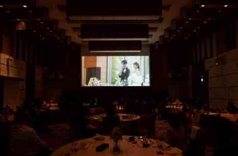 おふたりのご退場後に上映をするエンドロールムービーは会場前方の巨大スクリーンにてご覧いただきます。横8mの大きさで、まるで"映画館で観ている"かのような大迫力。森の緑や自然美を表現した柔らかな会場の雰囲気がシーンに合わせて変化します。明るい状態にて上映が可能なところも嬉しいポイントです。巨大スクリーンで会場全体が一体となり、皆様の多幸感をさらに高めました。