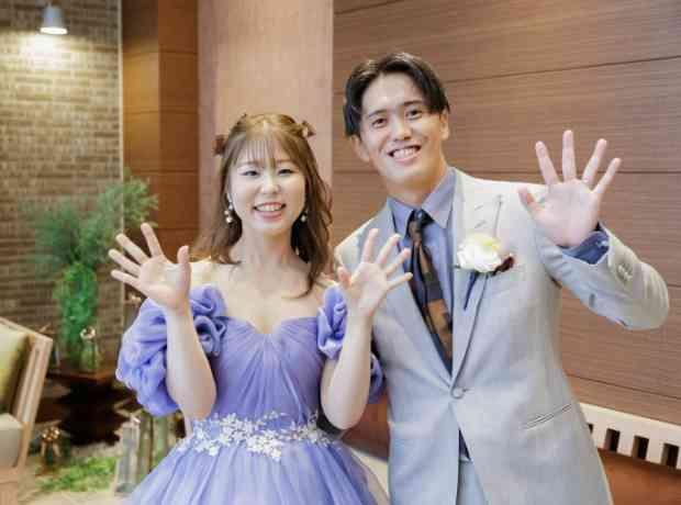 披露宴会場は緑豊かなTHE Villa 1stに。薄いラベンダーなども取り入れた、可愛らしくもエレガントな美しいコーディネート。お気に入りのウエディングドレスとも相性がよく、花嫁姿をさらに引き立てていました。青空が広がり、心地よく流れる水音が響く洗練された上質な空間の中で大切なゲストをお出迎えしました。