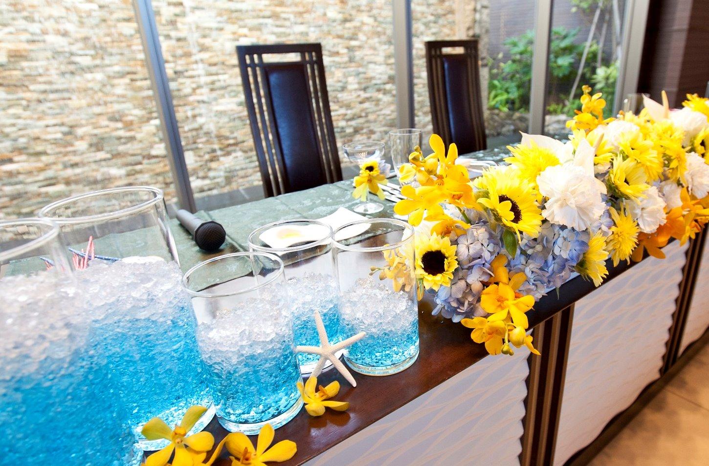トロピカルカクテルのような会場の席の花はお気に入りです。 貝がらやひまわりも取り入れ、夏らしさにこだわり、ゲストに喜んでもらえるコーディネイトを意識しました。 大好きな「海」「ひまわり」など夏満載の、大満足のサマーウエディングとなりました。