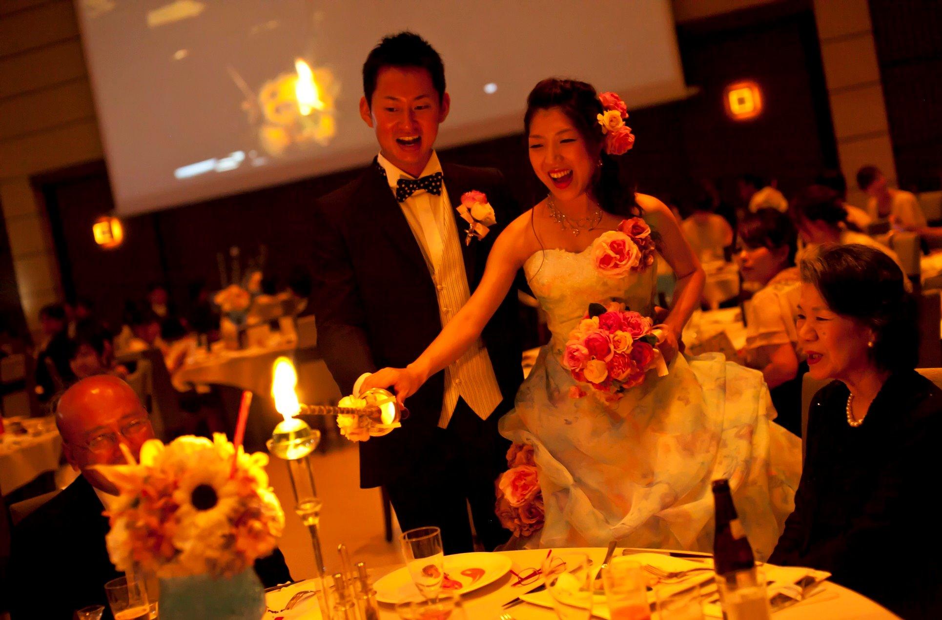 派手な演出は控え、ゲストに感謝の想いを伝えられるように考えた披露宴でした。幻想的に燃えるキャンドルを灯しながら、ご挨拶。しっかりと想いを伝えられた瞬間だと感じました。