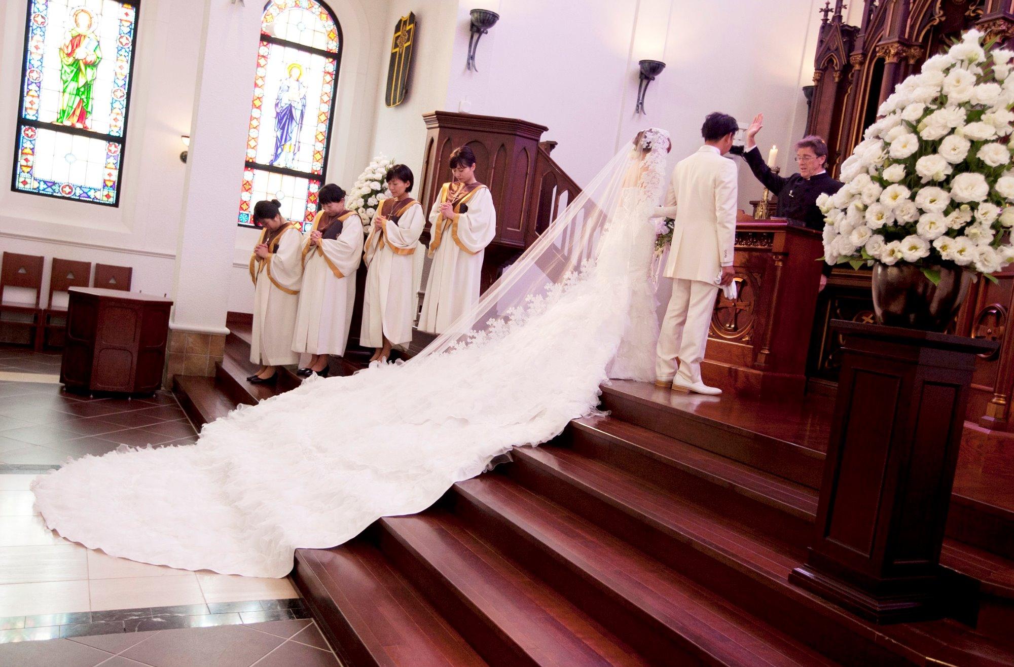 大聖堂のステンドグラスと生演奏は圧巻。迫力ある大聖堂での挙式に憧れる花嫁様も多いはず。女性ゲストからは、トレーンの長いドレスが大聖堂と合っていてよかったと絶賛でした。