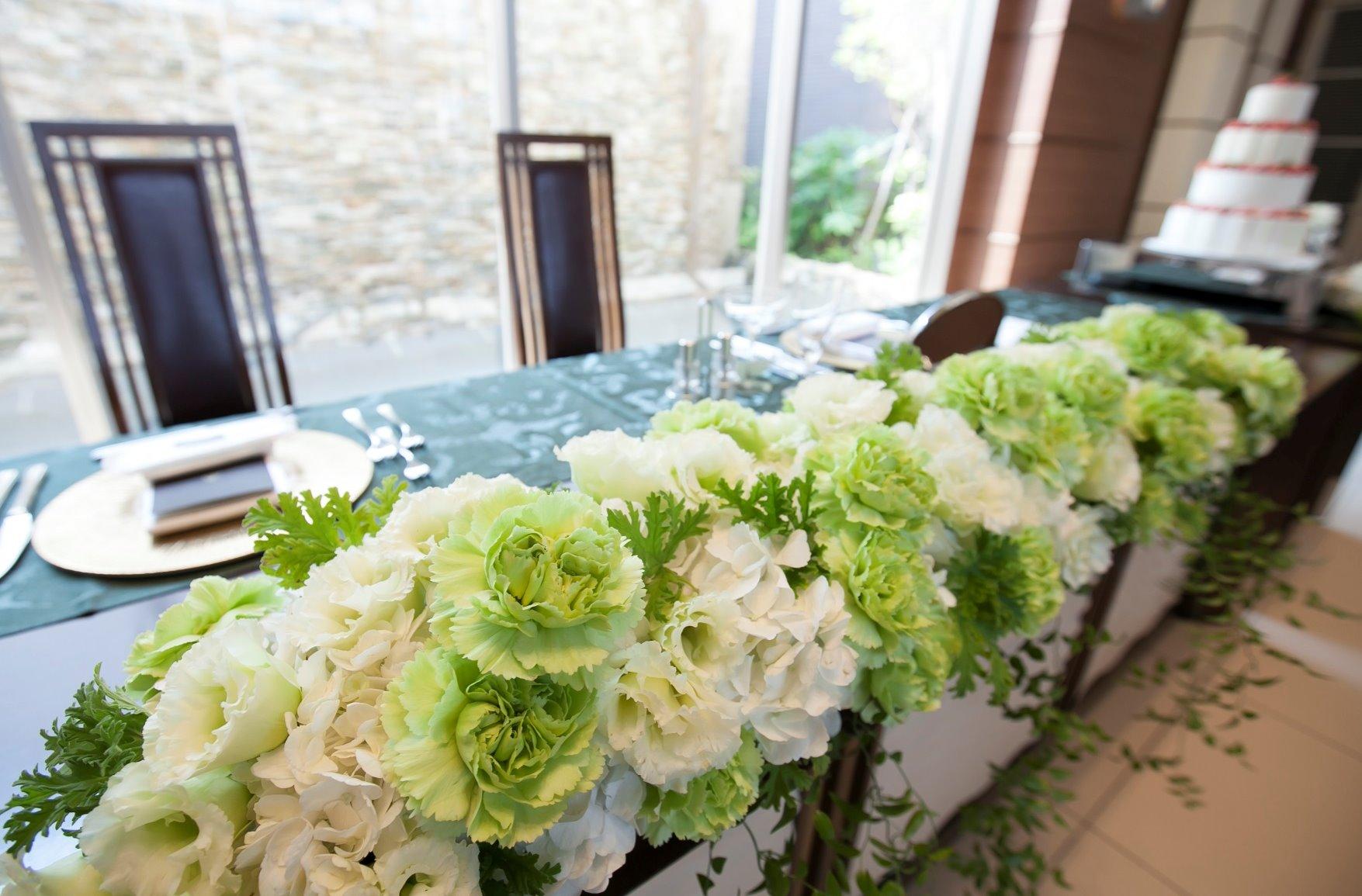 新婦様が大好きなホワイト×グリーンを基調にスッキリとしたこだわりのコーディネイト。陽の光が差し込む会場にピッタリのコーディネイトで、まるでガーデンでの披露宴のようでした。ゲストからもかわいいとの声も聞こえてきました。