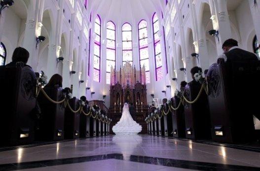 幸せの象徴とも呼ばれるトレーン。4mを超えるロングトレーンのドレスも大聖堂なら、ばっちり映えます。花嫁さまの入場シーンでは女性ゲストから歓声が上がるほどに。ステンドグラスの輝きのもと、照らされたウエディングドレスは本当に幻想的でした。木の温もりを感じることのできる大聖堂も必見です。