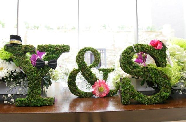 落ち着いた雰囲気の中にも可愛らしさを取り入れた披露宴会場。ブーケと同じ花のかすみ草を散りばめつつ、ガーベラを組み合わせた雰囲気は素敵でした。メインテーブルに大きなイニシャルを飾ったのも目を引きました。