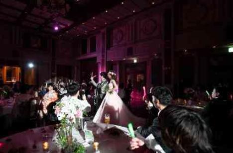 再入場ではドレス色当てクイズを行いました。 投票する色のペンライトをみんなに持ってもらいましたが会場がライブ会場のように。 予想外の色だったようで、ゲストからは驚きの声が上がっていました。 大好きな音楽に合わせて入場。手を振って迎えてくれる皆に囲まれて過ごす披露宴会場は最高に幸せな時間でした。