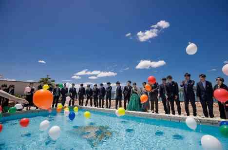 想いが通じ この日はとびきり晴れた青い空! プライベートガーデンの隣には綺麗な青い海! おふたりとゲストの皆さまの 「せーの!」という掛け声で風船をプールへIN! 水面に浮かんだ風船が 徐々に上空へ舞い上がっていきます 驚きの声と 綺麗だねと感動の声が広がり 大切なゲストの皆さまと一緒に特別な想い出をつくりました