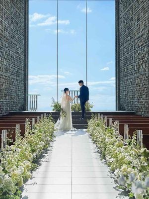 空へとつづくバージンロードをすすめば まるで空に抱かれるような幻想的なセレモニーが叶う「天空(そら)の教会」…手をとり合って祭壇へと共に歩むシーンは感動的