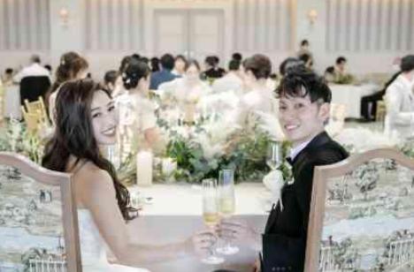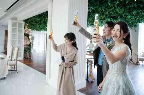 桜が満開の4月上旬。ゲストの皆様が楽しめる1日を一番に考えて準備されてきたおふたりが、まずご用意されたのは" something beige "という素敵なドレスコード。 テーマカラーの【ベージュ】を身につけた皆様が勢揃いした会場は一体感が抜群! パーティー後半にはベストドレッサー賞が発表され、受賞者のご発声で全員で"ワンモアチアーズ"!お酒を片手にパーティー後半がスタートしました。