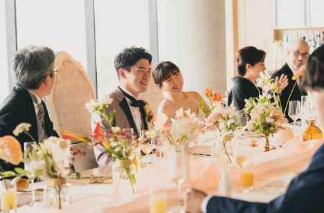 一面に広がる大きな窓から神戸を一望できるミラージュヴィラでのご家族やご親族と会食。絶景を眺めながらの食事は自然と会話も弾みます。 途中で登場したのは、たくさんの花がアレンジされた可愛らしいウェディングケーキ◎ご両親がご参加されてのお手本バイトやファーストバイトも、ご会食ならではの近い距離感で皆さまで盛り上がっていらっしゃいました。