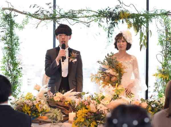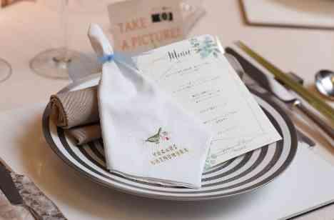 こだわりのコーディネートがされたパーティー会場は、まさしく春のひだまりのような空間に大変身。ゲスト一人ひとりのお席には、嬉しいおもてなしの名前入りのハンカチをご用意されました。ハンカチに刺繍されたウグイスやキツネも春を感じられます。 おふたりからの嬉しいおもてなしに、お席につかれたゲストから驚きと喜びの声が聞こえてきました。