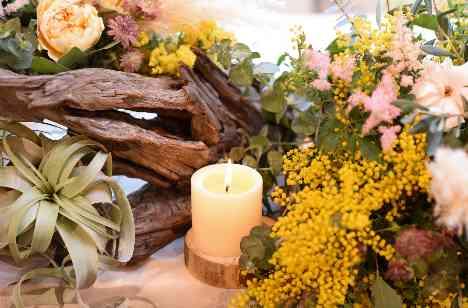 アートやカフェ巡りが好きな、ナチュラルでとてもおしゃれなおふたり。春のひだまりのような温かいパーティーになるようにプランを考えました。 コーディネートは、グリーンをベースにミモザなどの温かみのあるカラーのお花をプラスしました。 ペーパーアイテムなナチュラルな雰囲気にあわせて、温かい空間をつくりあげました。