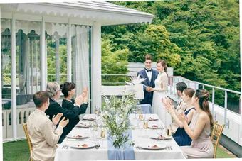 プライベートガーデンでの挙式とお食事ができるのは、少人数ウェディングならではの特権。都会にいながら、まるで海外挙式のようなパーティを実現することも!青空の下、小鳥のさえずりをBGMに、誓いのキスを交わして。