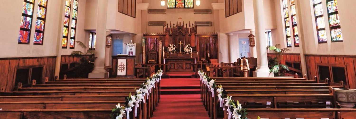 高い天井、広々とした館内の十字架をかたどったステンドグラスは、オアフ島最古のもの。 装飾品には最高級のコアの木がふんだんに使われ気品にあふれています。