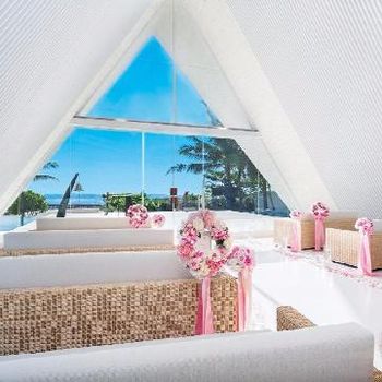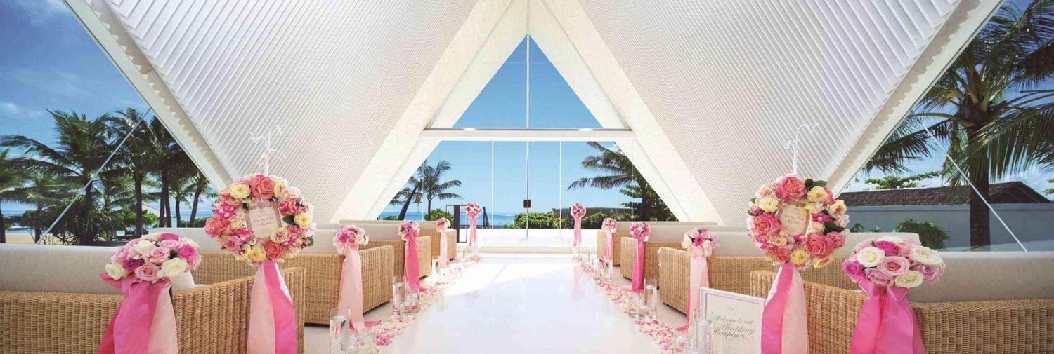 バリ島のヌサドゥア地区の高級ヴィラリゾート「ザ・ロイヤル・サントリアン」内のチャペル・ウル シャンティ。プライベート感を重視した、高級ヴィラと調和する柔らかな色遣いのモダン・バリウェディングが叶います。