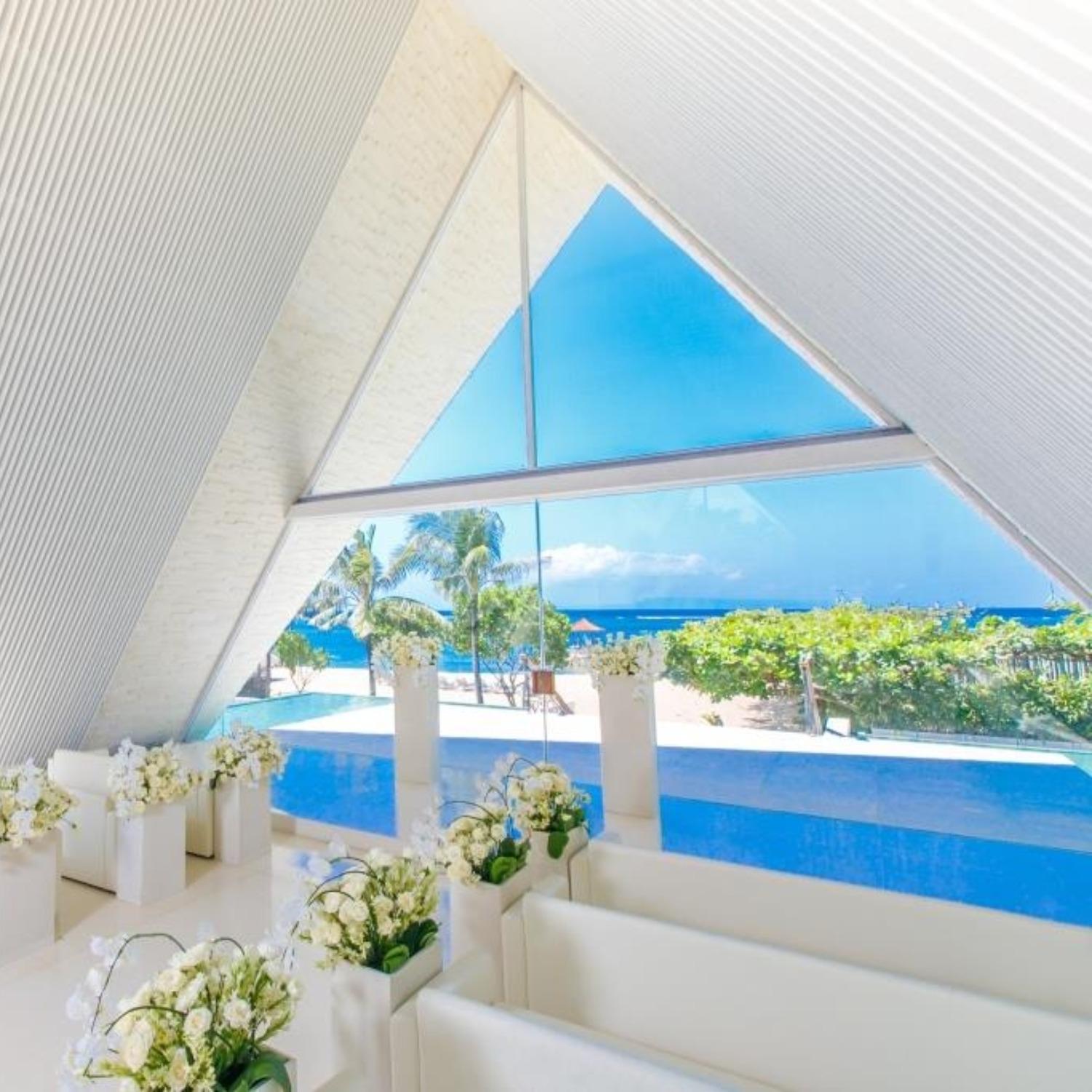 バリ島のヌサドゥア地区の高級ヴィラリゾート「ザ・ロイヤル・サントリアン」内のチャペル・ウル シャンティ。プライベート感を重視した、高級ヴィラと調和する柔らかな色遣いのモダン・バリウェディングが叶います。