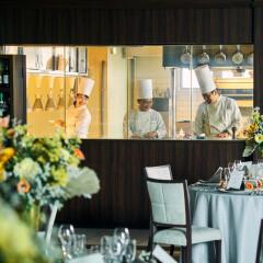 【至高の美食体験】専属シェフが会場併設のオープンキッチンで作るアツアツのお料理でおもてなし。試食には、手長エビのカダイフ、蟹とベーコンのラタトィユ、黒毛和牛フィレ肉とロースのグリエ、デザートをご用意。