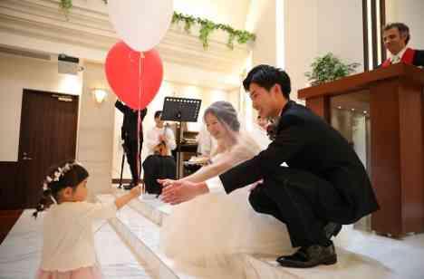 教会式でも温かな雰囲気に…どのようにしたらパーティーの前からお二人らしさを出せるのか考えた時、お支度から介入することにしました。入館後別室にてそれぞれお支度をしてタキシードとドレス姿仕上がった状態でファーストルックのシーンを設けました。 そして甥っ子くんと姪っ子ちゃんにも協力頂いて、可愛く風船を持ってリングボーイとリングガールを行いました。