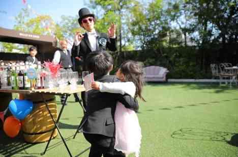プレパーティーからはアットホームな雰囲気にするためにすぐに披露宴会場に入るのではなくガーデンへ移動し、ここでウェルカムスピーチと乾杯を行いました。Hugマスターの前でHugをするとスペシャルドリンクが貰えます。お子様からご両家ご両親をはじめ沢山の愛情のこもったHugが行われ、一体感のある素敵な雰囲気に。