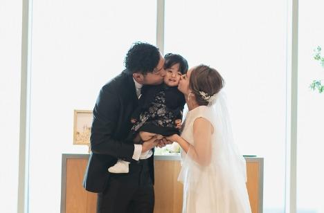 おふたりの大切なお子さまに誓うセレモニー もう家族はあるけれど、改めておふたりの人生を見つめなおす機会となったセレモニー。大切なお母さまからのベールダウンは改めてお互い涙のシーンとなりました。かわいいリングガールたちに指輪をとどけてもらい、おふたりはおこさまに誓いのキス。家族一緒に過ごせたこともとてもいい想い出とおっしゃっていただきました。
