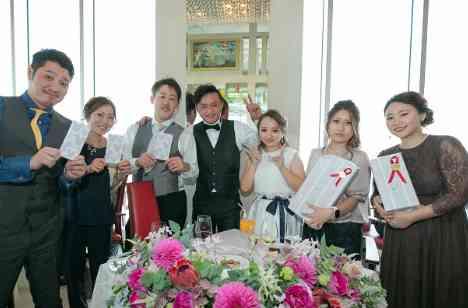 パーティでは、ゲストのみなさまへのプレゼントタイムをご用意。ウェディングケーキにシールを貼って、あたりの方にプレゼントをご用意。みなさま一斉に見ていただく、ワクワクタイムはとても楽しい時間をお過ごしいただけました。みなさまからのインタビューもいただき、懐かしいお話しをきくことができたりと、おふたりもとてもよろこんでいらっしゃいました。