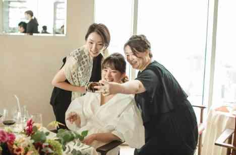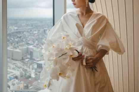 新婦が一目ぼれした素材にもデザインにもこだわったウエディングドレス。もともと別のドレスにしていたけれど、やっぱりこれがいいと、ファーストオーダー。初めて袖を通すドレスは、出会ってから、着る日がとても楽しみだったと。お気に入りのドレスだからこそ、ドレスチェンジはせず、できる限り長く着ていたい。今回は、ヘアとブーケを変えてお気に入りの1着でお過ごしになられました。