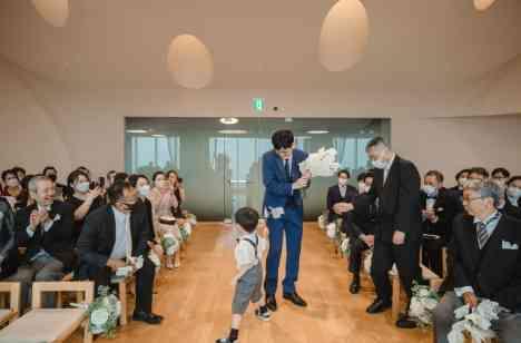 新郎さまが入場時にお花を集めて、新婦にプロポーズをするセレモニー。こだわりの胡蝶蘭を1本1本ゲストから受け取る新郎さまになんとサポーターの登場!甥っ子くんが、ゲストから受け取って、新郎さまにプレゼントしてくれるというとってもかわいいシーンが生まれました。こんな温かいシーンもゲスト一人ひとりにとって、かけがえのない記憶としてきざまれました。