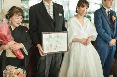 自分たちをここまで育ててくれた両親に贈る記念品。おふたりは悩んで末に、ありきたりなものではなく、意味のあるものが贈りたいとのことで、ご先祖さまから、つながったご縁を記したイラストの家系図をプレゼント。自分たちがここにいるのもすべてはご先祖さまのおかげ、そしてなにより両親のおかげ。この機会にルーツを見直すこともでき、かけがえのない記念品を贈呈。