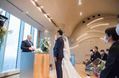 地上200mでのセレモニーは、ゲストに記憶に残してもらいたい。スタイルは人前式だからこそ、大切なゲストに登場してもらって誓えたら。ご友人に外国の方も多いおふたりは、なんとまさに牧師さんにいそうなご友人に代表立会人を依頼。おふたりが誓いをたてるとともに、ゲストからのお言葉も頂きました。まさに忘れられないセレモニーへ。