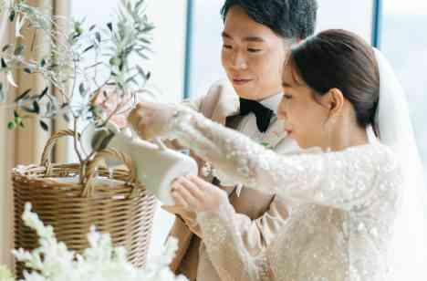 挙式中もゲスト全員が楽しめる様にとゲストに協力していただく様な時間をご用意されたお二人。受付中はオリーブの木に皆様から土を入れて頂き、挙式中にお二人が水を注ぎました。 そして指輪の交換でもゲストに参加してもらえる様にリングリレーを行い、退場の時にはゲストにリボンシャワーのご参加をいただきました。 皆様からの祝福の中笑顔でご退場されるお二人、そして見送るゲストの皆様も温かい笑顔で溢れていました。