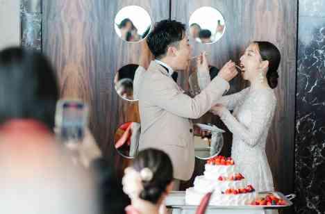 披露宴中にイベントはしないと決めたお二人でしたが、ゲストのシャッターチャンスになるようなケーキ入刀セレモニーや、ゲストを巻き込んでのサプライズバイトは取り入れました。 ケーキ入刀も、見ているゲストが思わず笑顔になってしまう様に同時に「あ~ん!」。ほほえましく見守られながらケーキを食べさせあいました。