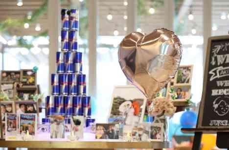 Aさん、Fさんが大好きなレッドブルやライブ会場みたいに盛り上がる空間を作りたい!やりたい事が沢山あるからこその迷いポイントもありました。ただ絶対やりたい事が、遊園地にあるようなパンダ号での入場だったのでパンダ号を呼べるかどうかも会場を決める上でのポイントでした。 レッドブルタワーはプチギフトとしても大活躍でした!