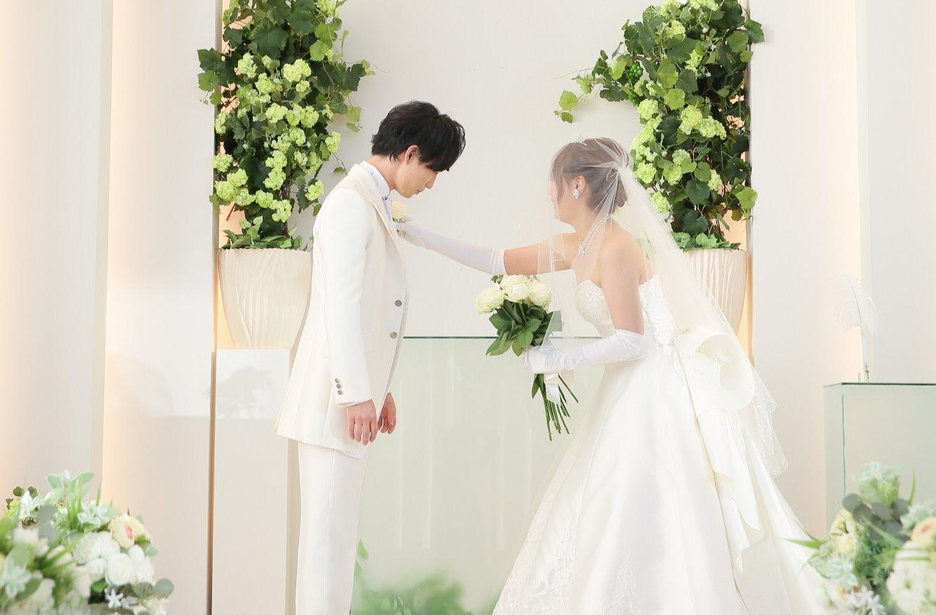 挙式では、ブーケブートニアの儀式を行ったおふたり。 真っ白なバラをゲストの方から受け取ってブーケをつくっていく新郎様。 お父様とご入場されて、新郎様からブーケを受け取った新婦様。 新郎様の胸元にブートニアを挿してプロポーズ成功♡ 成功後のお二人の笑顔はとても素敵な笑顔でした!