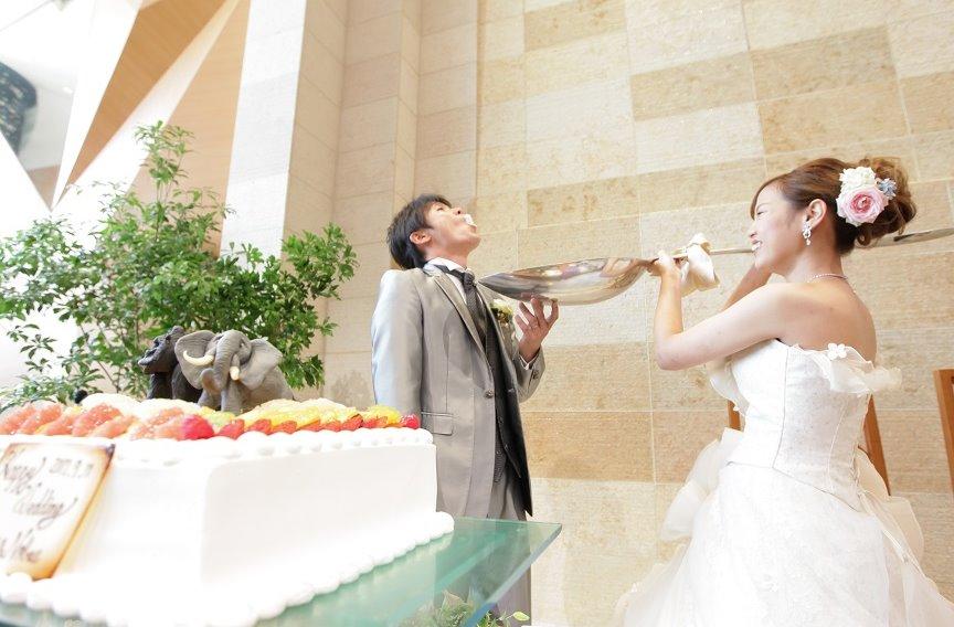 ウェディングケーキの上にはおふたりの好きなゴリラとゾウが! ファーストバイトでは超特大スプーンで愛情をいっぱい込めた演出を行いました! 新郎様が大きな愛情を受け止める姿は会場全体を笑顔にしました!