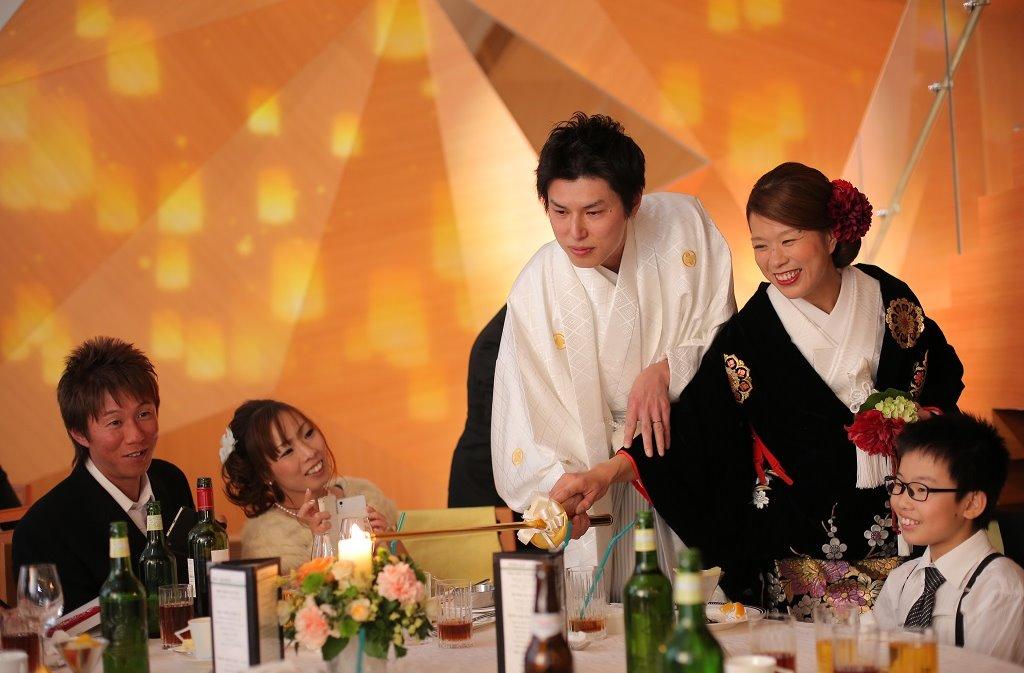 ゲストの皆様のもとへお進みいただきまして 皆様に見守られながらキャンドルへ火を灯されました。 温かな火が披露宴会場を包みました。 和装がとても映える演出です。